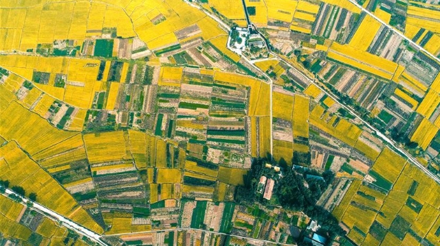 近日,位于太行山下的河北省涉縣白芟村上千畝水稻逐漸成熟。從空中俯瞰,猶如一塊塊“調(diào)色盤”,美不勝收。
