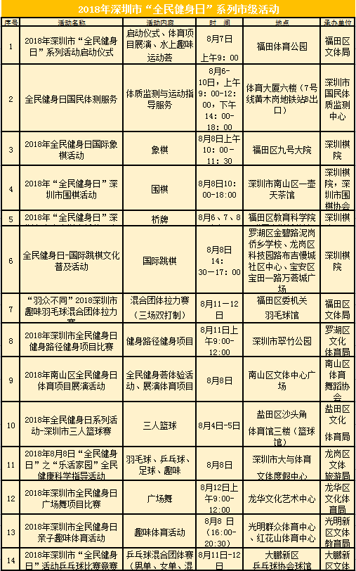 其中,市文體旅游局將于8月7日,在福田體育公園舉辦全民健身日啟動儀式,屆時將有體育項目展演、水上趣味運動薈等項目上演。此外,全市還將組織舉辦適合不同人群的“全民健身活動展示”、“全民健身嘉年華”活動,如全民健身科普宣傳、咨詢輔導(dǎo)、項目推廣、交流展示以及比賽等;面向全市市民舉辦大型國民體質(zhì)監(jiān)測、健身咨詢、大講堂等科學(xué)健身指導(dǎo)活動;引導(dǎo)和動員各級社會體育指導(dǎo)員開展義務(wù)健身輔導(dǎo),利用豐富的體育專業(yè)技術(shù)知識,深入開展全民健身志愿服務(wù)活動,免費向市民開放市屬公共體育場館(深圳體育館、深圳游泳跳水館、深圳網(wǎng)球中心、深圳體育場等四家體育場館)等。