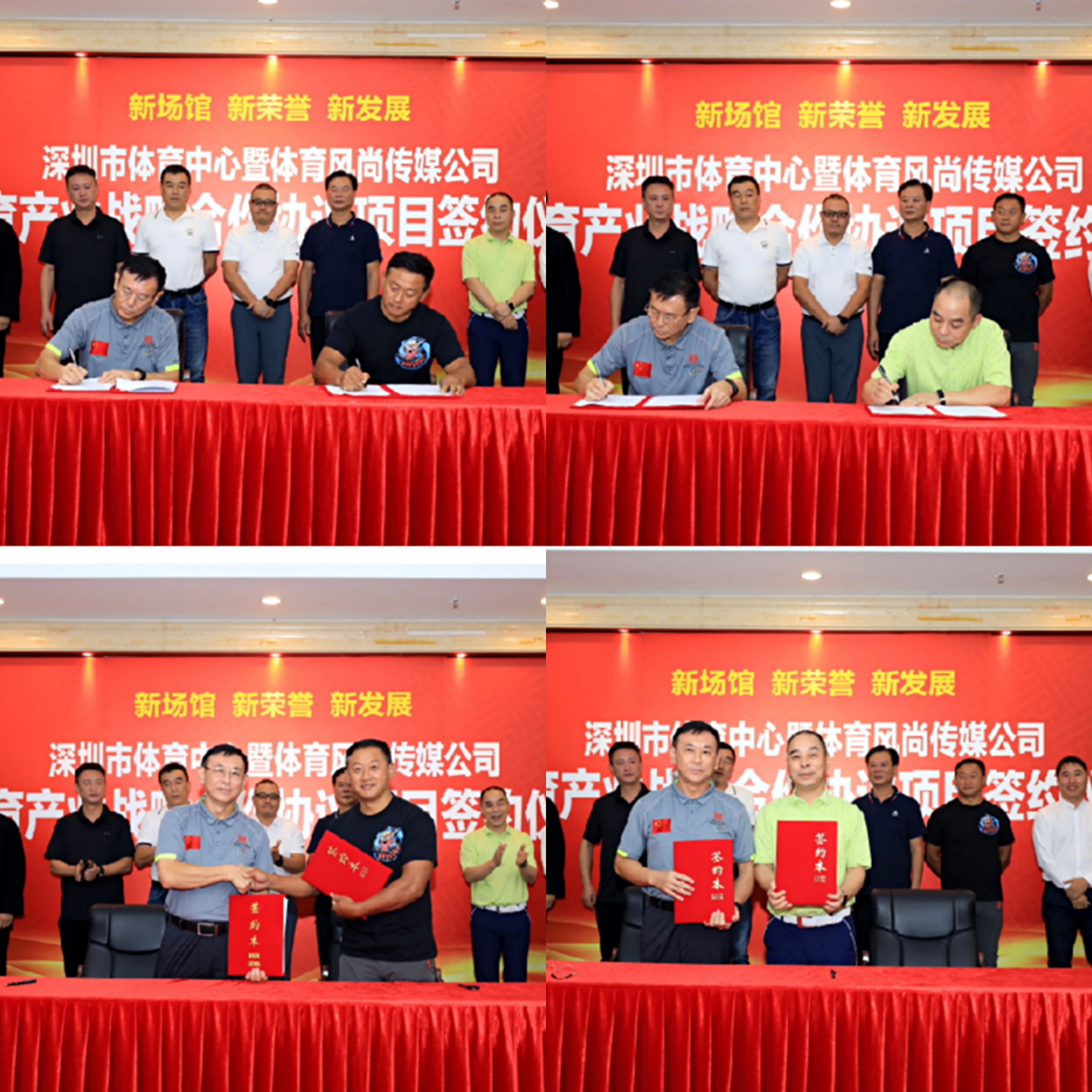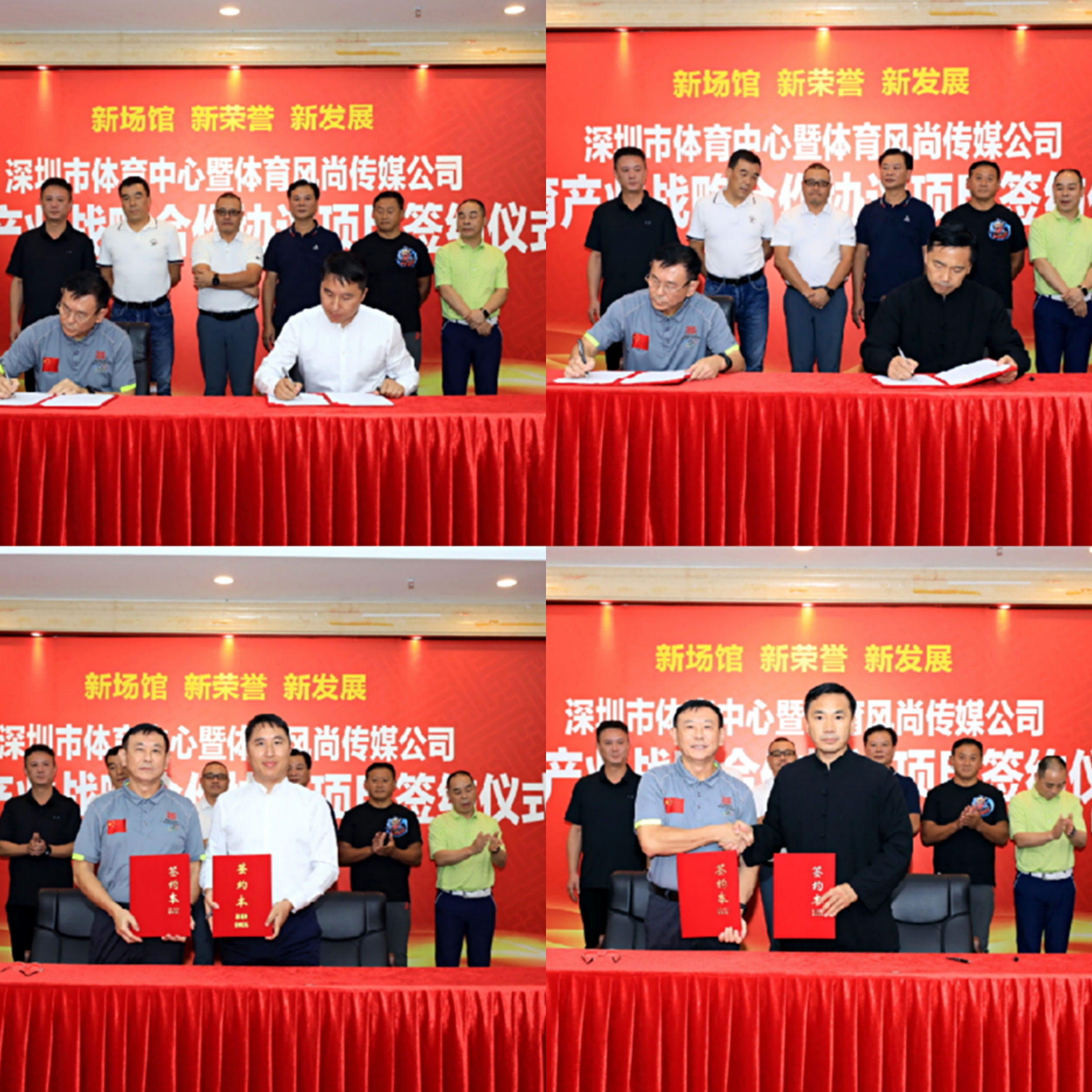 深圳體育風(fēng)尚傳媒發(fā)展有限公司代表深圳市體育中心與深圳最具規(guī)模的賽事承辦公司之一——深圳市五環(huán)體育產(chǎn)業(yè)發(fā)展集團(tuán)、深圳體育會展龍頭企業(yè)——深圳國際體育博覽會有限公司、擁有自有國內(nèi)最具規(guī)模的業(yè)余帆船賽事的深圳市帆海匯俱樂部投資發(fā)展有限公司、中國太極拳運(yùn)動權(quán)威機(jī)構(gòu)——深圳市弘武太極拳研究院四家深圳本土體育產(chǎn)業(yè)知名機(jī)構(gòu)代表簽訂了多項(xiàng)體育產(chǎn)業(yè)戰(zhàn)略協(xié)議,并與各方就體育中心未來體育產(chǎn)業(yè)發(fā)展方向及行業(yè)資源的引進(jìn)與落地進(jìn)行了深度探討。