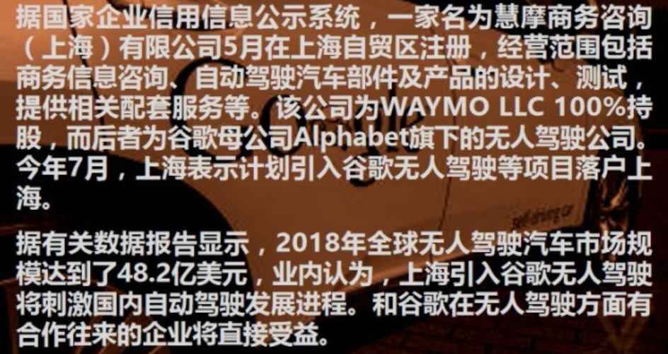 谷歌母公司Alphabet旗下研究自動(dòng)駕駛的部門Waymo在自動(dòng)駕駛領(lǐng)域處于全球領(lǐng)先水平,當(dāng)前其已經(jīng)完成800萬英里(約1287萬公里)自動(dòng)駕駛汽車公共道路測試,模擬測試?yán)锍踢_(dá)到50億英里(約80.47億公里)。Waymo計(jì)劃在為今年下半年向部分地區(qū)的美國消費(fèi)者推出無人駕駛服務(wù)。
