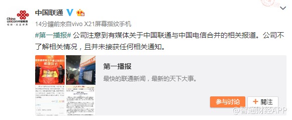 智通財(cái)經(jīng)APP獲悉,中國(guó)聯(lián)通在微博發(fā)布聲明稱,公司注意到有媒體關(guān)于中國(guó)聯(lián)通與中國(guó)電信合并的相關(guān)報(bào)道,不了解相關(guān)情況,且并未接獲任何相關(guān)通知。