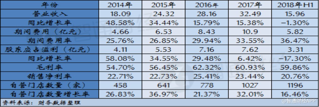 根據(jù)智通財(cái)經(jīng)APP的梳理,周黑鴨自營門店數(shù)量在2014年為458家,此后三年公司自營門店數(shù)量每年都有超過20%的增長,但期間公司營業(yè)收入增幅卻呈現(xiàn)放緩的趨勢。與此同時,公司門店數(shù)量的增長也帶來費(fèi)用率逐年提升,截至2017年,公司期間費(fèi)用率達(dá)到33.55%,以至于公司凈利潤增速同比下滑超過23個百分點(diǎn)。公司2018年中期財(cái)報(bào)顯示,上半年公司門店數(shù)量凈增長169家,較2017年增長16.46%,門店數(shù)量快速增長的勢頭雖然的已延續(xù),但卻支撐不起公司營收繼續(xù)保持增長,同時公司期間費(fèi)用率進(jìn)一步提升至36.47%,導(dǎo)致盈利水平大幅下滑。
