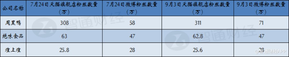 智通財(cái)經(jīng)APP曾在7月24日統(tǒng)計(jì)得到周黑鴨在當(dāng)天的天貓旗艦店粉絲數(shù)量為308萬,是其他兩大鹵制品公司的數(shù)倍,截至9月3日,周黑鴨天貓旗艦店的粉絲數(shù)量已經(jīng)增長至311萬,反觀絕味和煌上煌不僅沒有增長反而有小幅下滑。此外,周黑鴨微博粉絲數(shù)量在9月3日也增長至71萬較7月27日增長了13萬,而其他兩家公司的微博粉絲數(shù)量還在原地踏步。