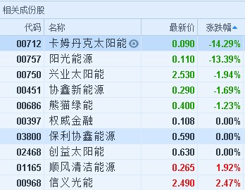 智通財經(jīng)APP獲悉,多只炒高的光伏股今日顯著回吐,截至11時53分,卡姆丹克太陽能(00712)跌14.29%,報價0.09港元,陽光能源(00757)跌13.39%,報0.11港元。