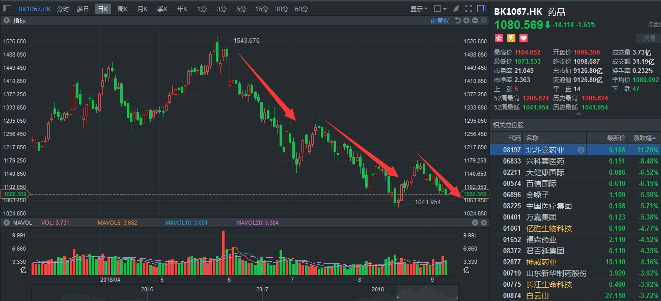 據(jù)智通財經APP觀察,截至9月10日,上證跌了1.21個點;恒指跌幅超過1.33%,50只成分股,僅包括九龍倉置業(yè)(01997)在內的6只股票小范圍飄紅,而醫(yī)藥板塊方面,繼續(xù)下挫,普遍以“掛綠”收盤,大勢可謂慘不忍睹。