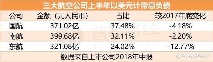 智通財經(jīng)APP了解到,2015年高峰時,三大航空公司美元負債水平普遍在80%左右。2018年中期財報顯示,截止2018年6月30日,國航以美元計的帶息負債占帶息負債總額比重已經(jīng)降至37.48%,南航、東航的美元帶息負債占比也分別降至32.11%、24.02%。絕對金額方面,目前以人民幣計美元有息負債規(guī)模,國航為371.02億、南航399.68億、東航321.08億。