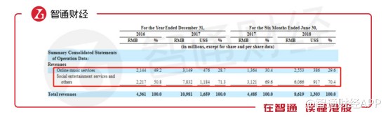 可以看到,2017年上半年,公司在線音樂服務(wù)與以音樂為核心的社交娛樂服務(wù)分別占到總收入的28.7%和71.3%,而在2018年上半年,這兩個(gè)數(shù)值為29.6%和70.4%。也就是說,社交娛樂服務(wù)為騰訊音樂的“核心業(yè)務(wù)”。