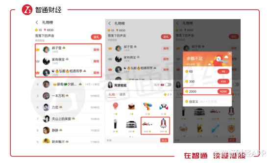 在用戶進(jìn)入K歌界面后,除了K歌按鍵還有就是歌曲榜單,這些榜單記錄的是該歌曲翻唱獲得禮物數(shù)的排行情況。翻唱歌手被打賞的禮物越多,榜單排名越高,禮物則是靠用戶通過現(xiàn)金兌換而來。與直播打賞類似,全民K歌也是通過用戶購(gòu)買虛擬禮物進(jìn)行變現(xiàn)。