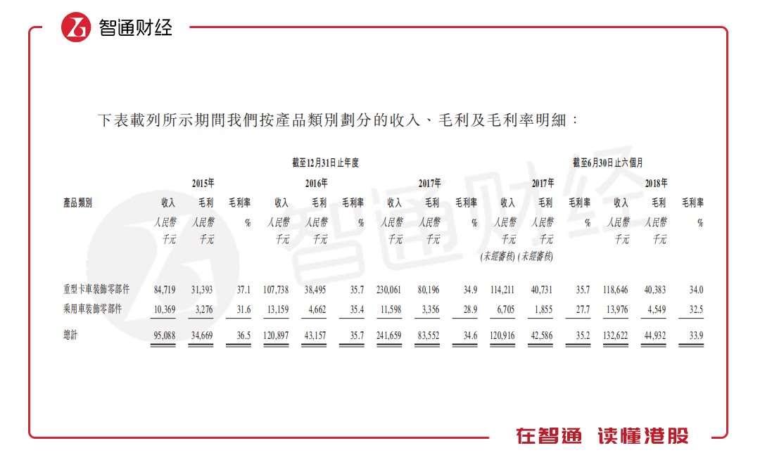 此外,天瑞在招股書(shū)中指出,就公司近期財(cái)務(wù)表現(xiàn)而言,公司的收入從截至2017年10月31日止10月的約1.97億元減至截至2018年10月31日止10個(gè)月的約1.92億元,略微減少為2.6%。然而,公司截至2018年10月31日止4個(gè)月的毛利率為35.8%,略高于上年同期的34.0%。鑒于收入減少并不明顯,以及與2018年上半年相比,公司截至2018年10月31日止4個(gè)月實(shí)現(xiàn)穩(wěn)定的毛利率及月平均毛利,因此并無(wú)跡象顯示公司的重型卡車(chē)裝飾零部件業(yè)務(wù)分部會(huì)顯著下跌。