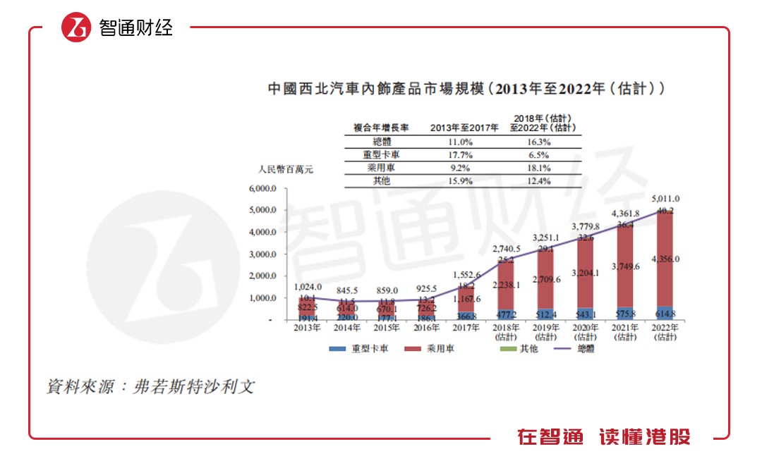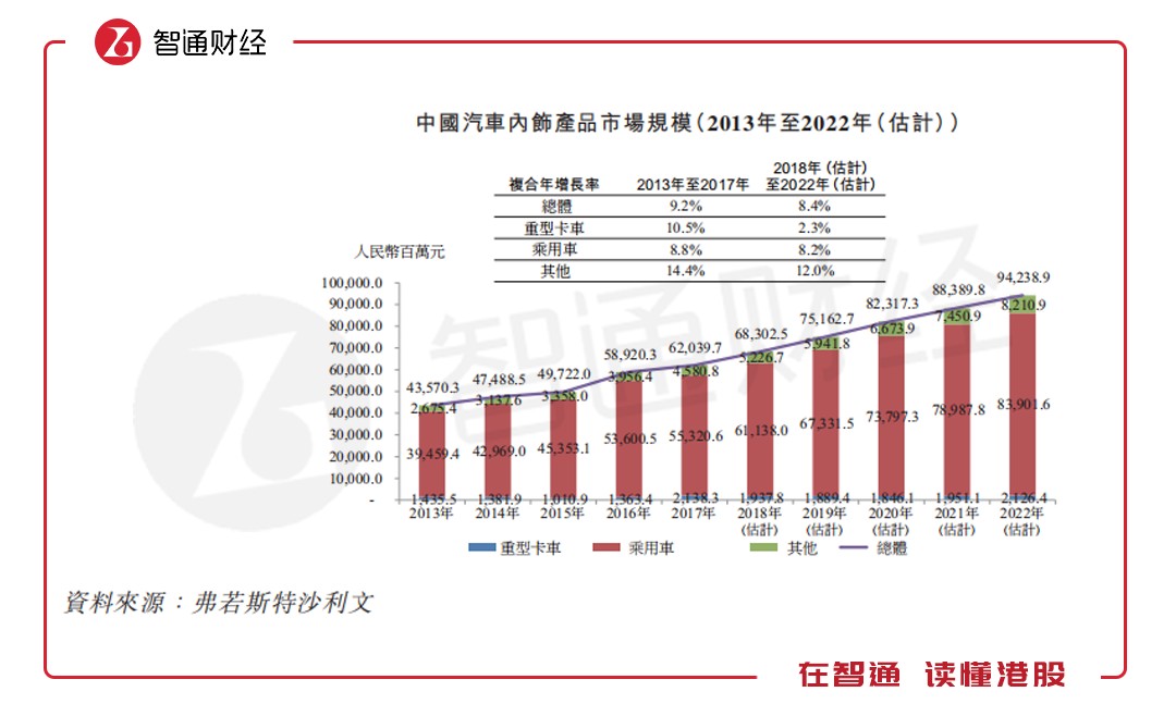 智通財(cái)經(jīng)APP進(jìn)一步查閱天瑞招股說(shuō)明書(shū)發(fā)現(xiàn),從行業(yè)來(lái)看中國(guó)汽車(chē)內(nèi)飾產(chǎn)品市場(chǎng)的總值由2013年的435.7億元增至2017年的620.4億元,復(fù)合年增長(zhǎng)率為9.2%。估計(jì)市場(chǎng)規(guī)模將于2022年達(dá)到942.39億元,2018年至2022年期間的復(fù)合年增長(zhǎng)率為8.4%。