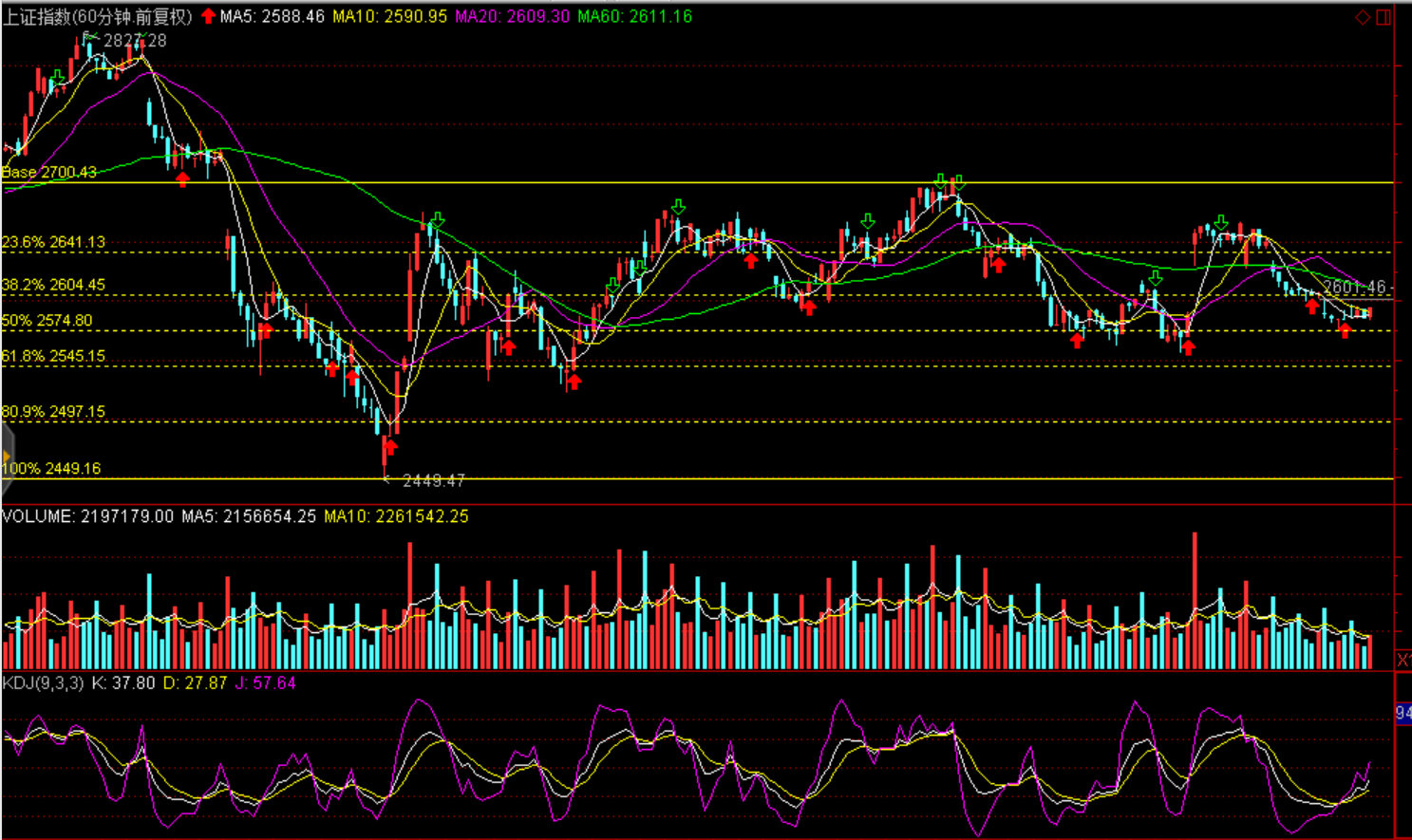 技術面:短期企穩(wěn)回升,弱勢反彈,60分鐘黃金分割線滬綜指2604點、2641點、創(chuàng)業(yè)板1360點一線存在壓力。