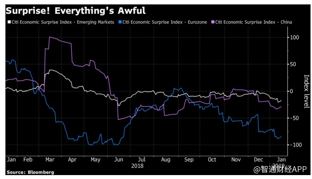 兩位分析師表示,歐洲和新興市場(chǎng)的經(jīng)濟(jì)驚喜指數(shù)均陷入負(fù)值區(qū)間。而標(biāo)普500指數(shù)成份股公司約有三分之一的營(yíng)收來(lái)自海外,海外市場(chǎng)的進(jìn)一步疲軟可能最終會(huì)令美國(guó)國(guó)內(nèi)的增長(zhǎng)前景變得黯淡。此外,美國(guó)國(guó)內(nèi)的經(jīng)濟(jì)增長(zhǎng)前景在一定程度上也已經(jīng)因美國(guó)政府部分關(guān)門而減弱。