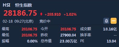 智通財(cái)經(jīng)APP獲悉,恒生指數(shù)開盤漲285.91點(diǎn)或1.02%,報(bào)28186.75點(diǎn)。國企指數(shù)漲1.1%,報(bào)11057.72點(diǎn)。紅籌指數(shù)漲1.07%,報(bào)4499.71點(diǎn)。大市盤前成交18.16億港元。中美經(jīng)貿(mào)高級(jí)別磋商結(jié)束。1月份社會(huì)融資數(shù)據(jù)超預(yù)期。