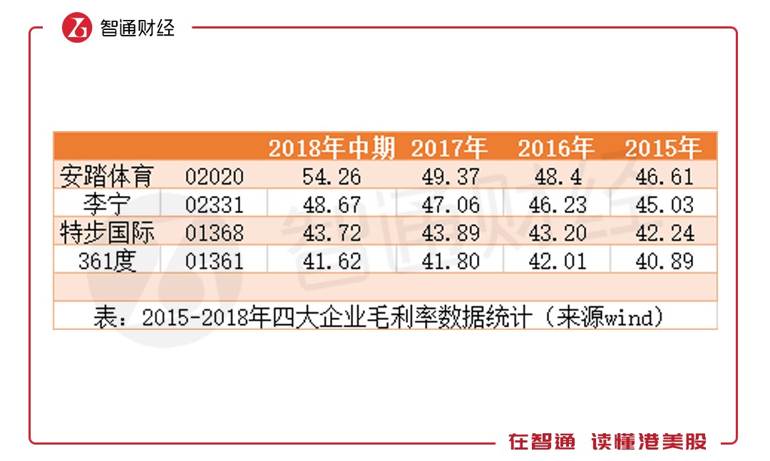 與存貨周轉(zhuǎn)率一起穩(wěn)步增長(zhǎng)的,還有毛利率,從2015年的45.03%上升至2018年上半年的48.67%。但與安踏一比,差距就出來了。2015年時(shí),雙方的毛利率差距僅1.58個(gè)百分點(diǎn)。但隨著安踏規(guī)模的擴(kuò)大,規(guī)模響應(yīng)逐漸體現(xiàn),李寧與安踏的毛利率差距加大,2018年上半年時(shí),差距擴(kuò)大至5.59個(gè)百分點(diǎn),但李寧毛利率仍高于特步和361。