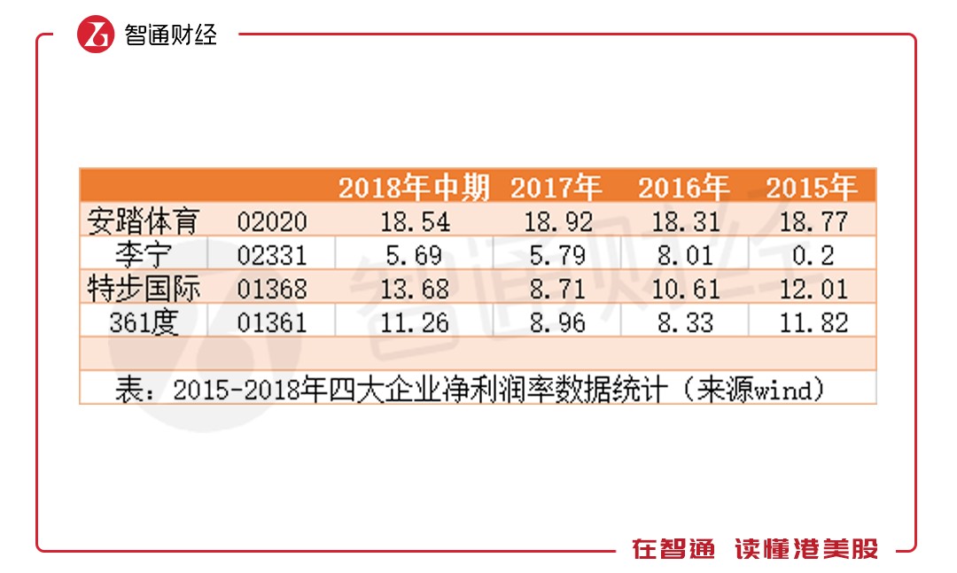 然而,高毛利優(yōu)勢(shì)并未在利潤(rùn)中體現(xiàn)。2015年時(shí),李寧的凈利潤(rùn)率為0.2%,2016年時(shí)上升至8.01%,2018年上半年時(shí),安踏、特步、361的凈利潤(rùn)率分別為18.54%、13.68%、11.26%,均遠(yuǎn)高于李寧的5.69%。