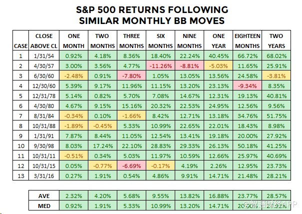 追溯到1950年,標(biāo)普500指數(shù)的月線圖出現(xiàn)過13次相似的走勢(shì)。如下表所示,在這一形態(tài)出現(xiàn)后的兩年里,股市基本上一直走牛: