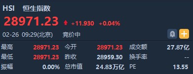 智通財(cái)經(jīng)APP獲悉,恒生指數(shù)開盤漲0.04%%,報(bào)28971.23點(diǎn)。國企指數(shù)張0.19%,報(bào)11653.15點(diǎn)。紅籌指數(shù)張0.13%,報(bào)4565.49點(diǎn)。大市盤前成交27.87億港元。隔夜美股小幅收漲,大型科技股集體收漲,港股ADR指數(shù)全日僅微升。