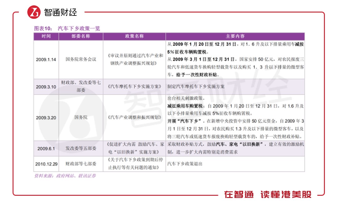 智通財(cái)經(jīng)APP了解到,此次汽車下鄉(xiāng)并非首次,我國(guó)曾于2009年開展的汽車下鄉(xiāng),當(dāng)時(shí)新增中央投資安排50億資金,對(duì)農(nóng)民購買的指定車型進(jìn)行補(bǔ)貼,但該項(xiàng)政策于2010年退出舞臺(tái)。2015年因汽車銷量萎靡,政策再次出馬,當(dāng)時(shí)主要以減征車輛購置稅為主,但并非汽車下鄉(xiāng)措施。