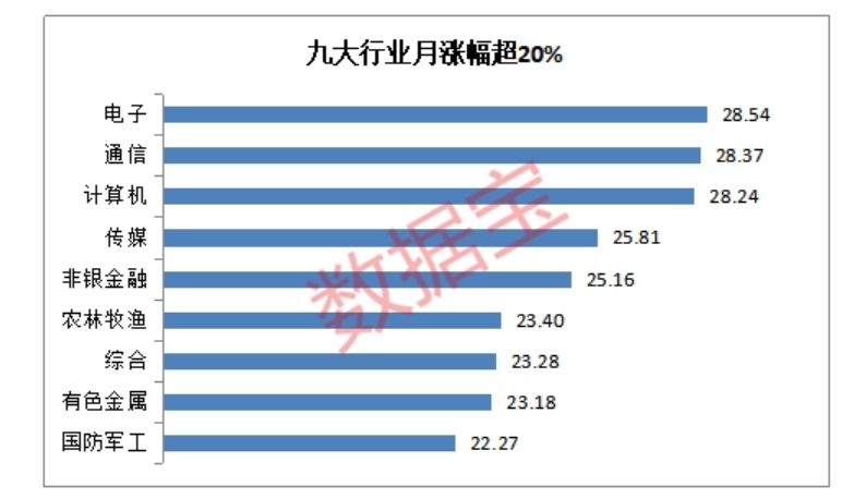 28個申萬一級行業(yè)中,有9個行業(yè)二月份的漲幅超過20%,電子、通信、計算機、傳媒、非銀金融行業(yè)漲幅超過25%,位列前五。28個行業(yè)的月平均漲幅為18.4%,行業(yè)普漲現(xiàn)象明顯。