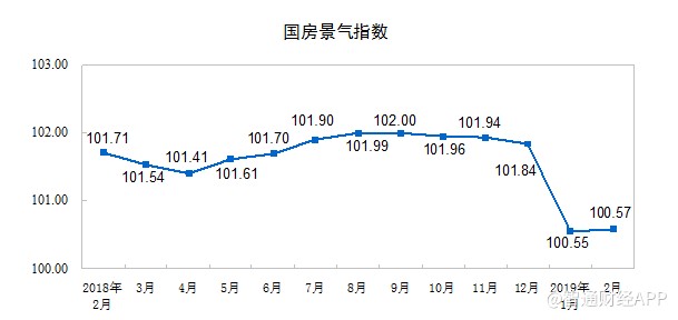 2月份,房地產(chǎn)開發(fā)景氣指數(shù)(簡稱“國房景氣指數(shù)”)為100.57,比2018年12月份回落1.27點(diǎn)。