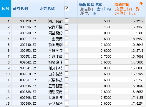 據(jù)統(tǒng)計,今年高送轉(zhuǎn)(10送5以上)個股共41只,其中流通市值20億一下的共計15只,列舉出來,供投資者參考。