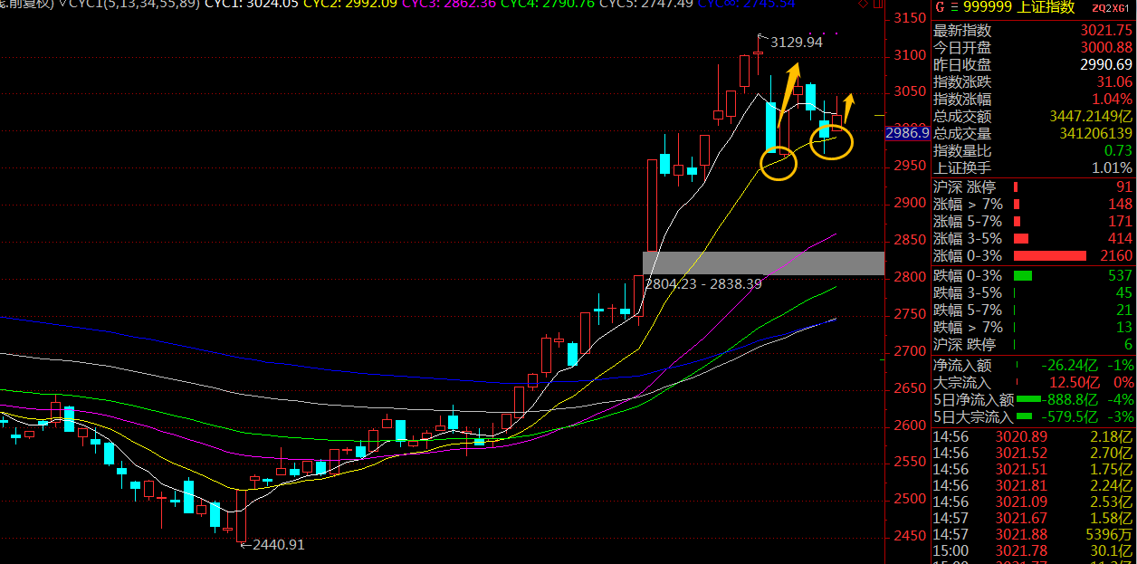 如果能在2938點企穩(wěn),則后續(xù)行情相對樂觀,也可以在較短時間內(nèi)完成調(diào)整。同時,結(jié)合日k圖的成本均線指標看,兩次回踩十天成本均線,反彈力度呈現(xiàn)出減弱的趨勢,這地方走出第一種走勢的概率大大增加(跌破2938點)。