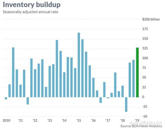 美國官方表示,1季度的增長超出了預(yù)期,部分原因是強(qiáng)勁的庫存增長。根據(jù)政府的數(shù)據(jù),本季度新增商品庫存320億美元,折合年率為1280億美元,推動(dòng)了GDP增長約70個(gè)基點(diǎn)。