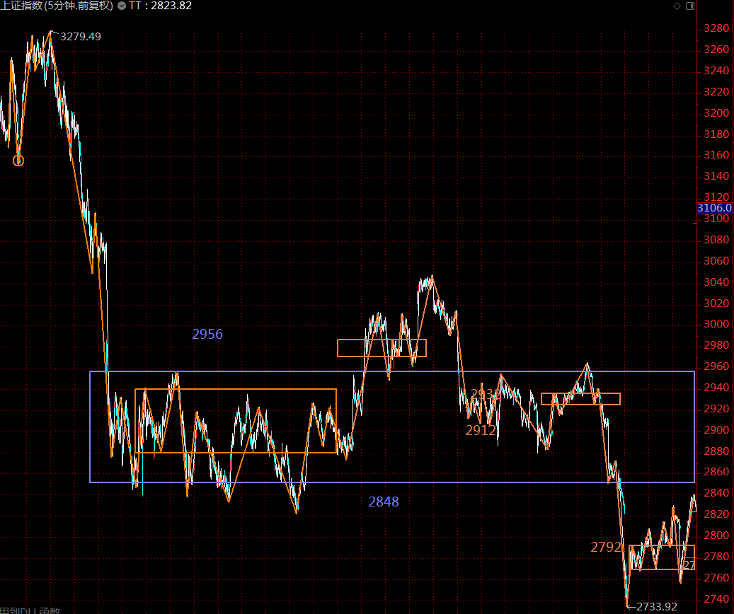 上周市場(chǎng)整體都處在構(gòu)建第三類賣點(diǎn)的階段,周五的高點(diǎn)2840目前初步確認(rèn)為第三類賣點(diǎn)的精確位置,如果就此轉(zhuǎn)下,下一步2792點(diǎn)就顯得尤為重要,如果往下的五分鐘線段未能跌破2792點(diǎn),那這個(gè)位置是一個(gè)合理的建倉點(diǎn),等同于針對(duì)下方三十分鐘中樞(九段擴(kuò)張)的第三類買點(diǎn)。