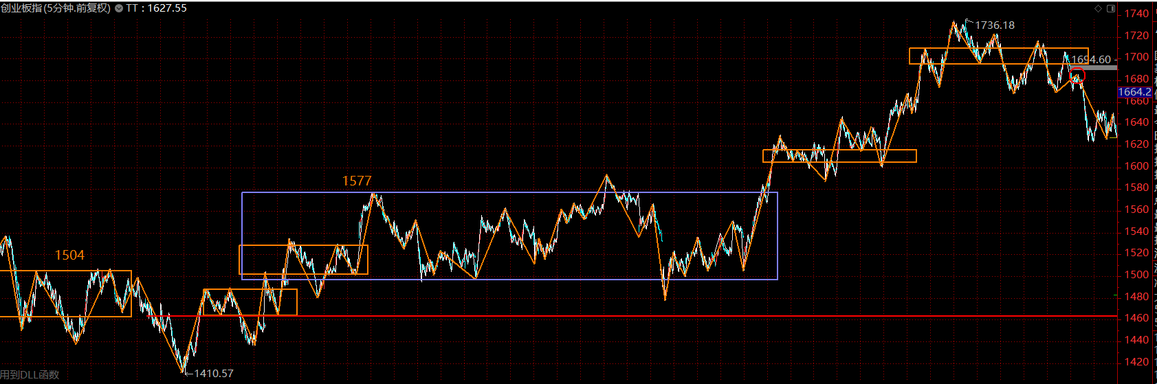 本輪行情的領先指數——創(chuàng)業(yè)板指數仍舊為多頭排列,目前同樣進入了五分鐘下跌趨勢第二個中樞的構建過程,可依托1600-1620區(qū)域展開布局。