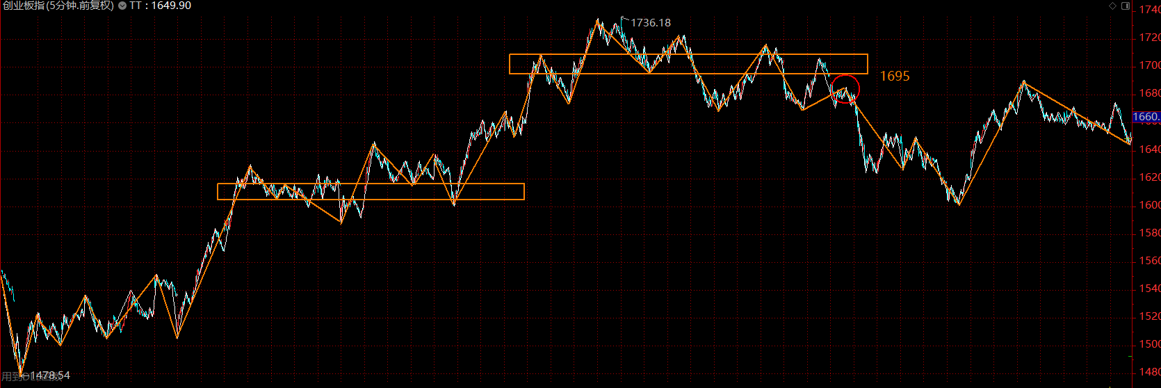 創(chuàng)業(yè)板依舊被上方五分鐘中樞下軌1695點壓制,回踩段連線段都沒有構成,比較弱勢。本周初的反抽如果不能站上1695點,大概率還要繼續(xù)回落,完成結構。