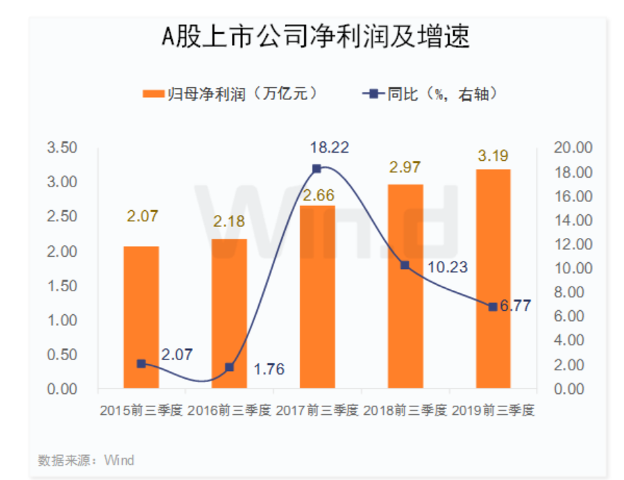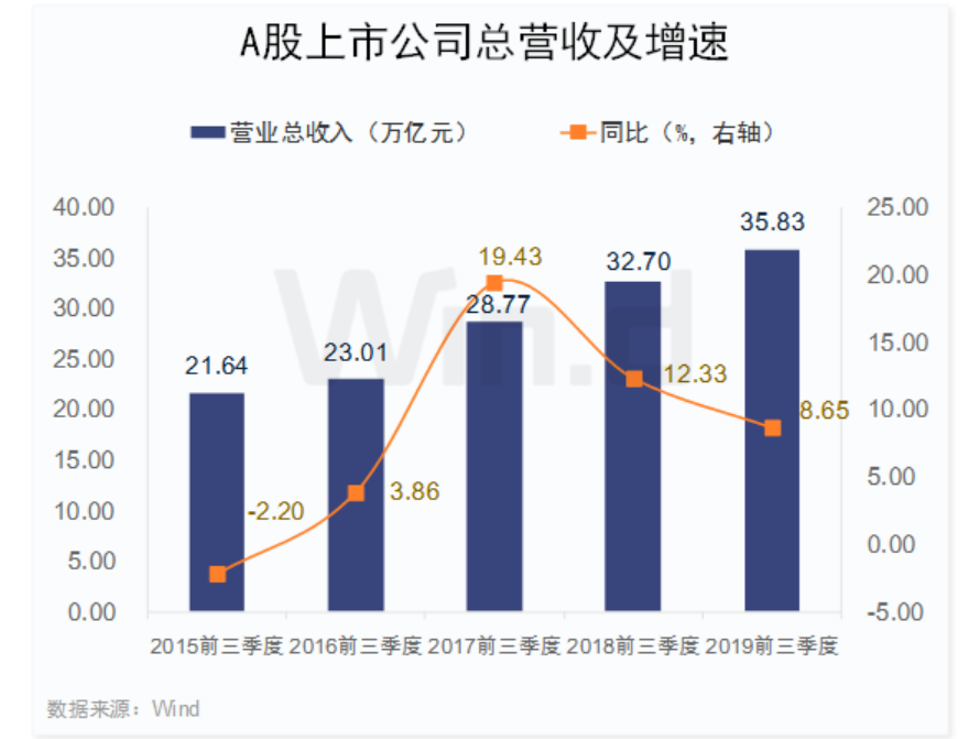2019年前三季度A股上市公司合計(jì)實(shí)現(xiàn)營(yíng)業(yè)總收入35.83萬(wàn)億元,同比增長(zhǎng)8.65%;實(shí)現(xiàn)凈利潤(rùn)(備注:以下統(tǒng)計(jì)均為歸屬母公司凈利潤(rùn))3.19萬(wàn)億元,同比增長(zhǎng)6.77%。