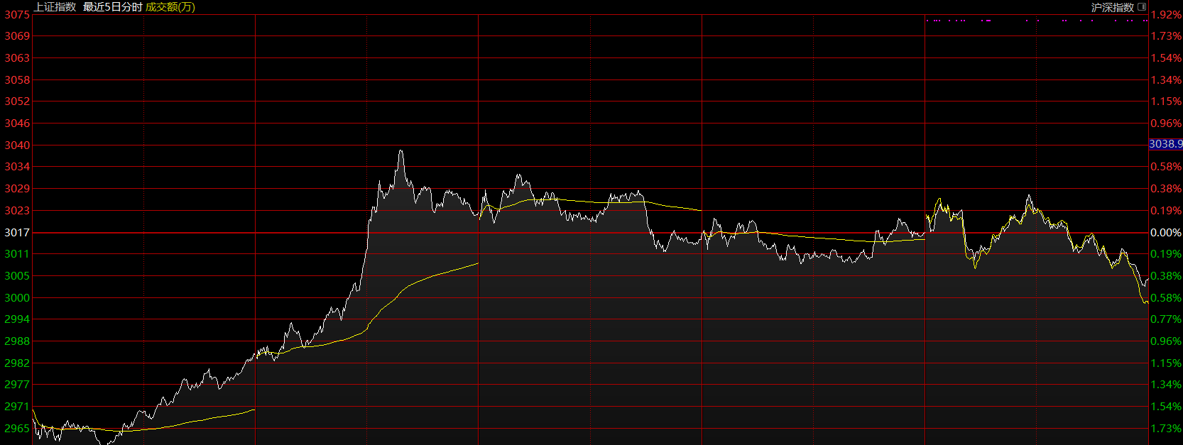 目前分析只需集中于這個(gè)五分鐘的上漲趨勢(shì)即可,上周如期做出了五分鐘上漲趨勢(shì)第二個(gè)中樞的雛形。前面幾天表現(xiàn)其實(shí)蠻超預(yù)期的,特別是科技股的逼空,A股似乎許久未見(jiàn)了。核心問(wèn)題出在周五,周五有兩個(gè)點(diǎn)顯示出當(dāng)下市場(chǎng)的外強(qiáng)中干,第一個(gè)在于周五早盤(pán)南京證券反包漲停時(shí),市場(chǎng)資金的失衡,明顯看出科技股與券商股兩臺(tái)“抽水機(jī)”從前幾天的互相配合變成了互相傷害;這一段跳水直接將圖形破壞,強(qiáng)度大的新高背馳可以說(shuō)已經(jīng)沒(méi)有了,那下午上拉無(wú)力后的跳水也就在情理之中。