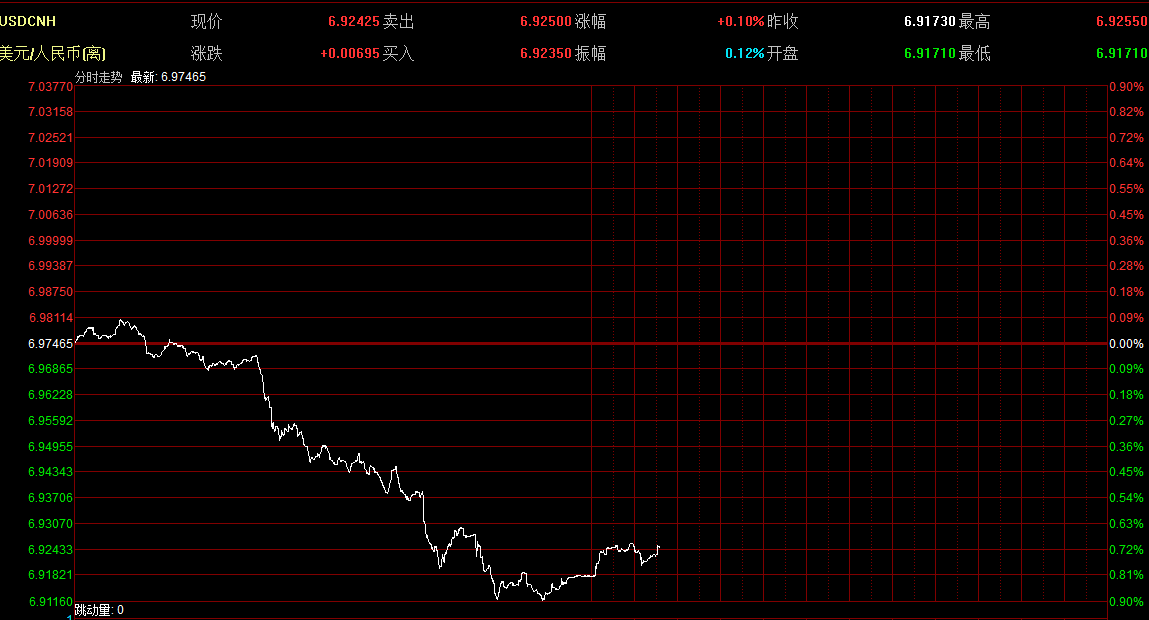 10月30日,離岸人民幣兌美元匯率再度跌破6.97關(guān)口,盤中觸及6.9773低點,創(chuàng)10年來新低。截至19時15分報6.9732,貶值16基點:在岸人民幣即期匯率報6.9639,貶值17基點。