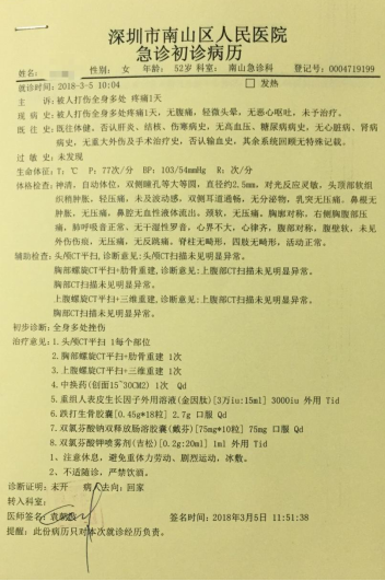 第二天,張女士立刻去深圳市南山區(qū)人民醫(yī)院急診科就診,初步診斷為“全身多處挫傷”。羅小姐說,“當時的法醫(yī)鑒定結(jié)果是輕微傷,法醫(yī)鑒定貼好封條交給了派出所?!?/p>