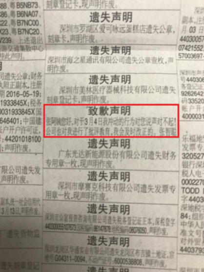 在3月24日的報紙上,記者在整版密密麻麻的分類信息中,終于找到了埋藏在其中的一條“致歉聲明”——“張阿姨您好,對于3月4日我沖動的行為對您說聲對不起!公司也對我進行了批評教育,我會及時改正的?!庇浾呗?lián)系該版服務(wù)熱線,對方表示登報這則致歉聲明的價格為200元左右。(田志強)
