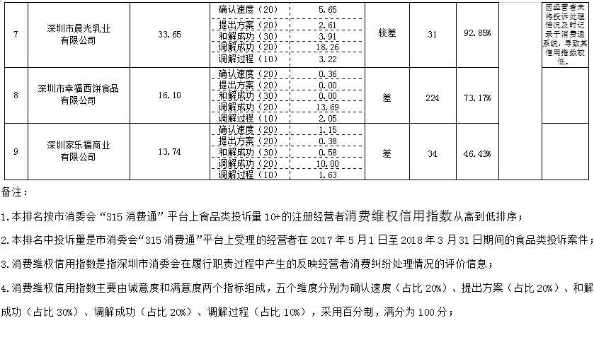 深圳市食品行業(yè)消費(fèi)維權(quán)信用指數(shù)排行榜為市消委會(huì)“315消費(fèi)通”平臺(tái)上注冊(cè)企業(yè)的消費(fèi)維權(quán)信用指數(shù)排名,企業(yè)消費(fèi)維權(quán)信用指數(shù)的高低,反映了企業(yè)處理消費(fèi)投訴的真實(shí)情況,對(duì)消費(fèi)者具有較強(qiáng)的消費(fèi)指導(dǎo)作用。深圳市消委會(huì)在此提醒“315消費(fèi)通”注冊(cè)企業(yè),及時(shí)處理消費(fèi)者投訴、與消費(fèi)者提早和解,嚴(yán)格按照消費(fèi)通系統(tǒng)要求記錄投訴處理情況。