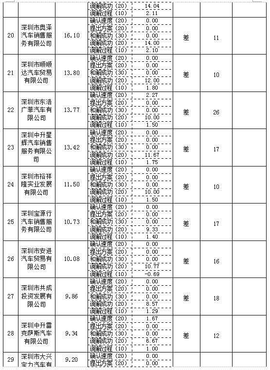 在細(xì)分指標(biāo)方面,深圳市標(biāo)域汽車有限公司、深圳標(biāo)特汽車(集團(tuán))有限公司和深圳市宏創(chuàng)陸風(fēng)汽車銷售有限公司等27家企業(yè)處理投訴不及時(shí),未積極與消費(fèi)者先行和解,導(dǎo)致其企業(yè)“確認(rèn)速度”、“提出方案”和“和解成功”三項(xiàng)分項(xiàng)指標(biāo)的分?jǐn)?shù)皆為0,嚴(yán)重影響了企業(yè)的消費(fèi)維權(quán)信用指數(shù)和信用等級(jí)。深圳市仁孚特力汽車服務(wù)有限公司、深圳市安進(jìn)汽車貿(mào)易有限公司和深圳市大興寶譽(yù)汽車銷售服務(wù)有限公司在由消委會(huì)工作人員評分的“調(diào)解過程”分項(xiàng)指標(biāo)分?jǐn)?shù)為負(fù)分,3家企業(yè)存在不配合調(diào)解甚至拒絕調(diào)解的情況,解決消費(fèi)糾紛的誠意度較差;另外,深圳市宏創(chuàng)陸風(fēng)汽車銷售有限公司的消費(fèi)維權(quán)信用指數(shù)為0,誠意度和滿意度為0,10宗消費(fèi)投訴皆未處理成功,排名最后。