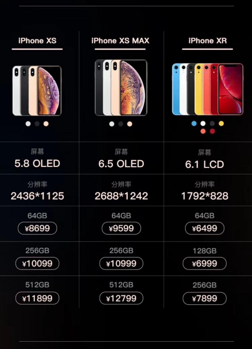這次的三款新機(jī)都以“iPhone X”為命名基礎(chǔ),可以看做是X的半代升級(jí)版本,分別叫做iPhoneXR、iPhoneXS、iPhoneXS Max,三者主要區(qū)別在屏幕大小上:5.8英寸、6.1英寸和6.5英寸。
