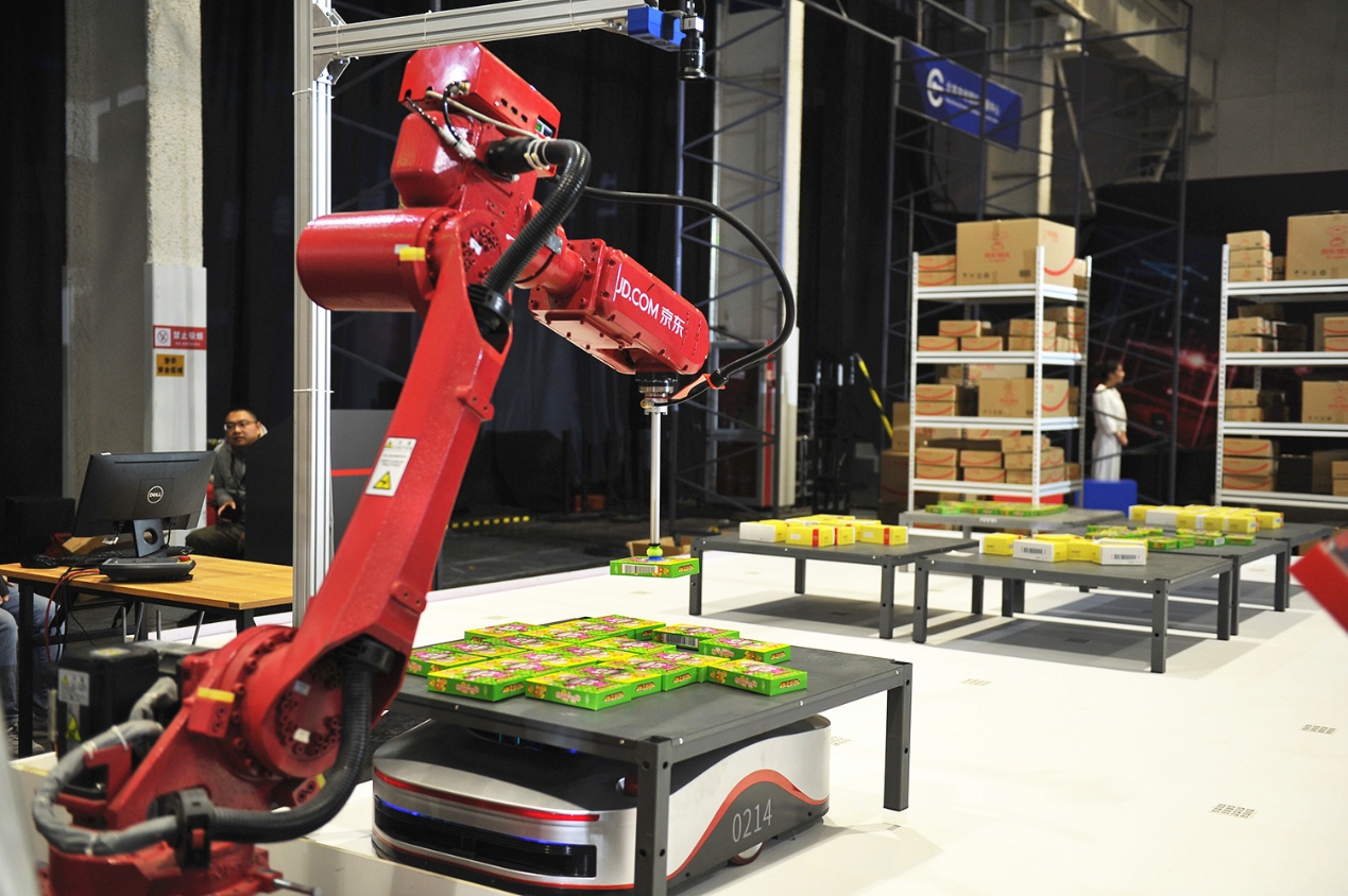 為了展現無人倉的全程智能化流程,本次峰會外展區(qū)設置了智能動態(tài)展區(qū)。在現場,動態(tài)運行的揀選機械臂、自動打包機與飛馬機器人、智能叉車等一起,共同構成了京東無人倉強大的倉儲系統(tǒng)。目前在京東智能化倉儲體系內,智能機器人設備已經實現了家用電器、美妝個護、電腦辦公、服飾內衣、醫(yī)療保健等五大訂單品類的應用場景覆蓋,通過地狼、天狼、分揀AGV、交叉帶分揀機、AGV叉車、機械臂等12種自主研發(fā)機器人的投用,大大提升了京東的訂單處理效率。