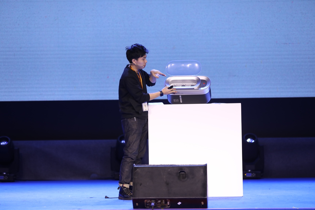 10件作品的設(shè)計師全部完成作品答辯后,7位評委進(jìn)入評審室進(jìn)行統(tǒng)計結(jié)果復(fù)議。在此期間,首屆金箍棒國際設(shè)計大獎賽金獎得主賈鵬,以及金箍棒工業(yè)產(chǎn)品設(shè)計江陰有限公司運營總監(jiān)何田鑫分別上臺,為現(xiàn)場觀眾帶來產(chǎn)品設(shè)計和創(chuàng)業(yè)理念方面的分享,獲得了現(xiàn)場的陣陣掌聲。