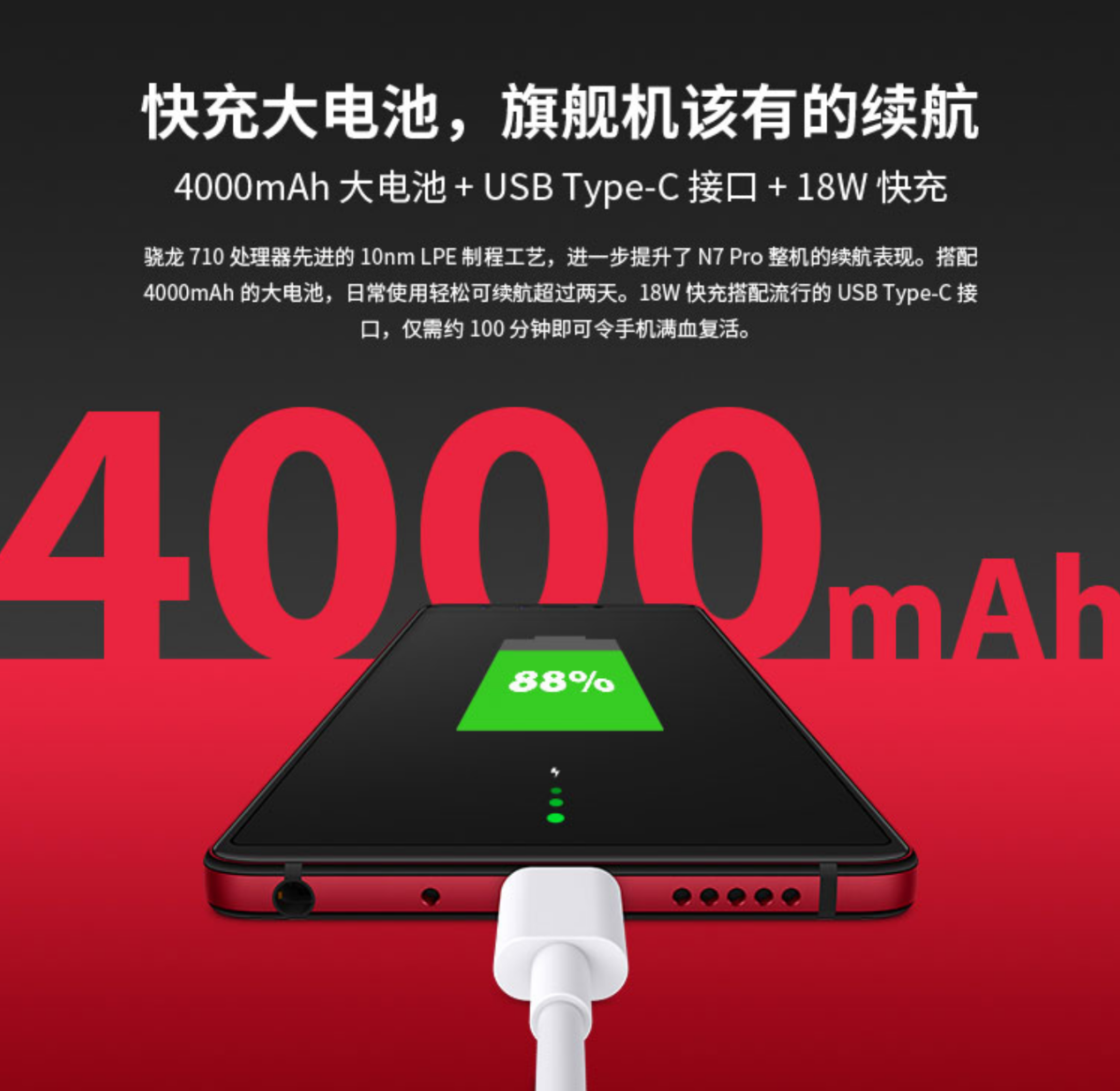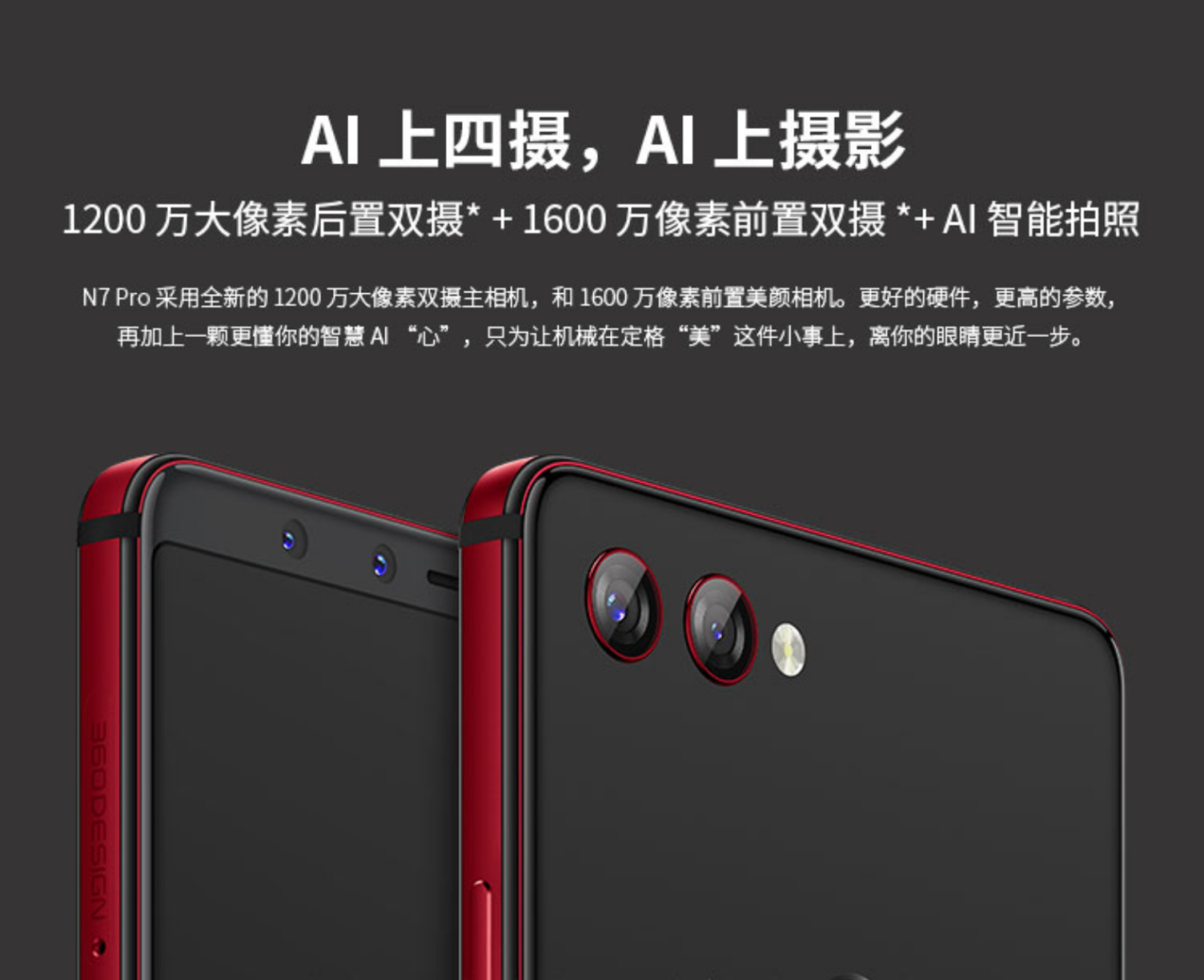 360手機(jī)N7 Pro采用了雙面玻璃機(jī)身設(shè)計(jì),無(wú)劉海5.99英寸全面屏,分辨率2160×1080像素,有珊瑚紅和瑪瑙黑兩色可選。作為2018年度的旗艦機(jī)型,配置上,N7 Pro搭載當(dāng)前高通家族中最受關(guān)注的驍龍710處理器,4000mAh大容量電池,支持18W快充,官方宣稱(chēng)20分鐘可充電30%,100分鐘可充滿(mǎn)。此外在拍照方面,360手機(jī)N7 Pro采用了堪稱(chēng)耀眼的四攝設(shè)計(jì)。
