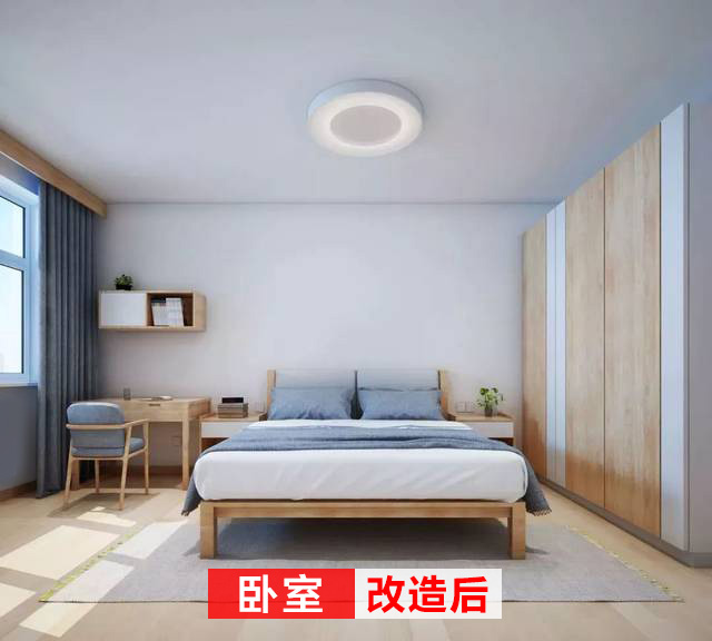 改造后的臥室開(kāi)闊簡(jiǎn)潔,藍(lán)灰色床品與窗簾,色調(diào)一致,一整排的衣柜完全可以滿足生活需求。