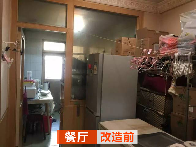 改造前的餐廳不僅僅是餐廳,還有一根晾衣繩,做晾衣區(qū);同樣餐廳也是很亂的,灰色的玻璃看起來(lái)很臟。