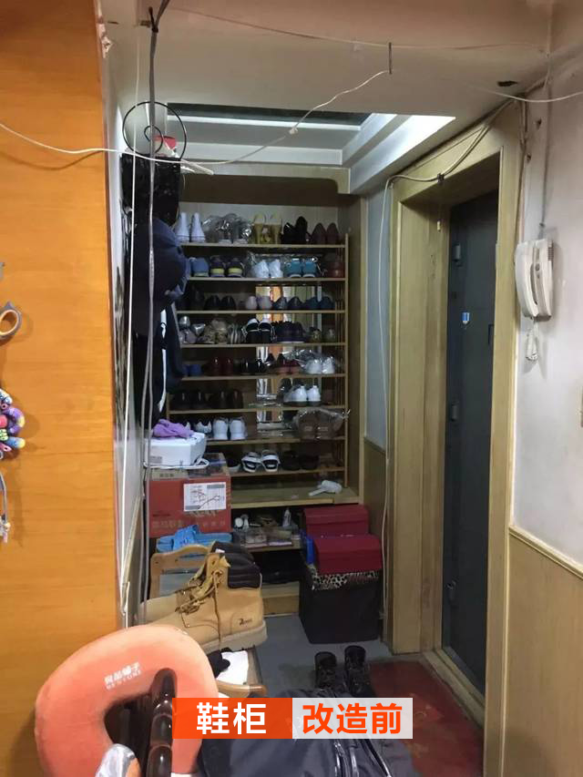 改造前的入戶亂七八糟,而且實(shí)用性很差;鞋柜已經(jīng)做到頂了,頂上的鞋子拿取非常不方便,很多的東西都直接堆在那邊。