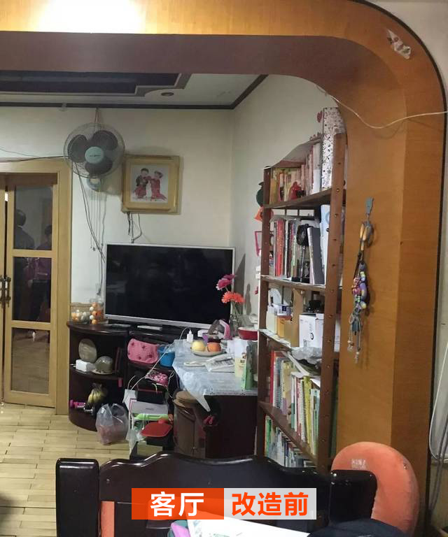 改造前客廳包了一個(gè)大門套,看起來(lái)不美觀,而且很笨重;客廳也放了一部分書,七七八八的東西塞在電視柜下,顯得客廳也是雜亂無(wú)章。