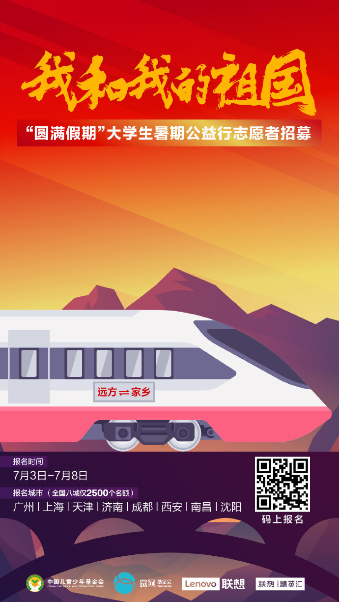7月3日,由中國兒童少年基金會、北京圓網(wǎng)慈善基金會和聯(lián)想集團(tuán)共同發(fā)起的“‘我和我的祖國’圓計劃—圓滿假期大學(xué)生暑期公益行”活動,面向全國8個城市的大學(xué)生正式開啟志愿者招募,邀請回鄉(xiāng)大學(xué)生加入到為廣大留守兒童群體量身定制的公益行動中,幫孩子團(tuán)圓、為孩子圓夢、讓愛心圓滿。對于大學(xué)生來說,這將是一次獨(dú)特的公益實(shí)踐經(jīng)歷。