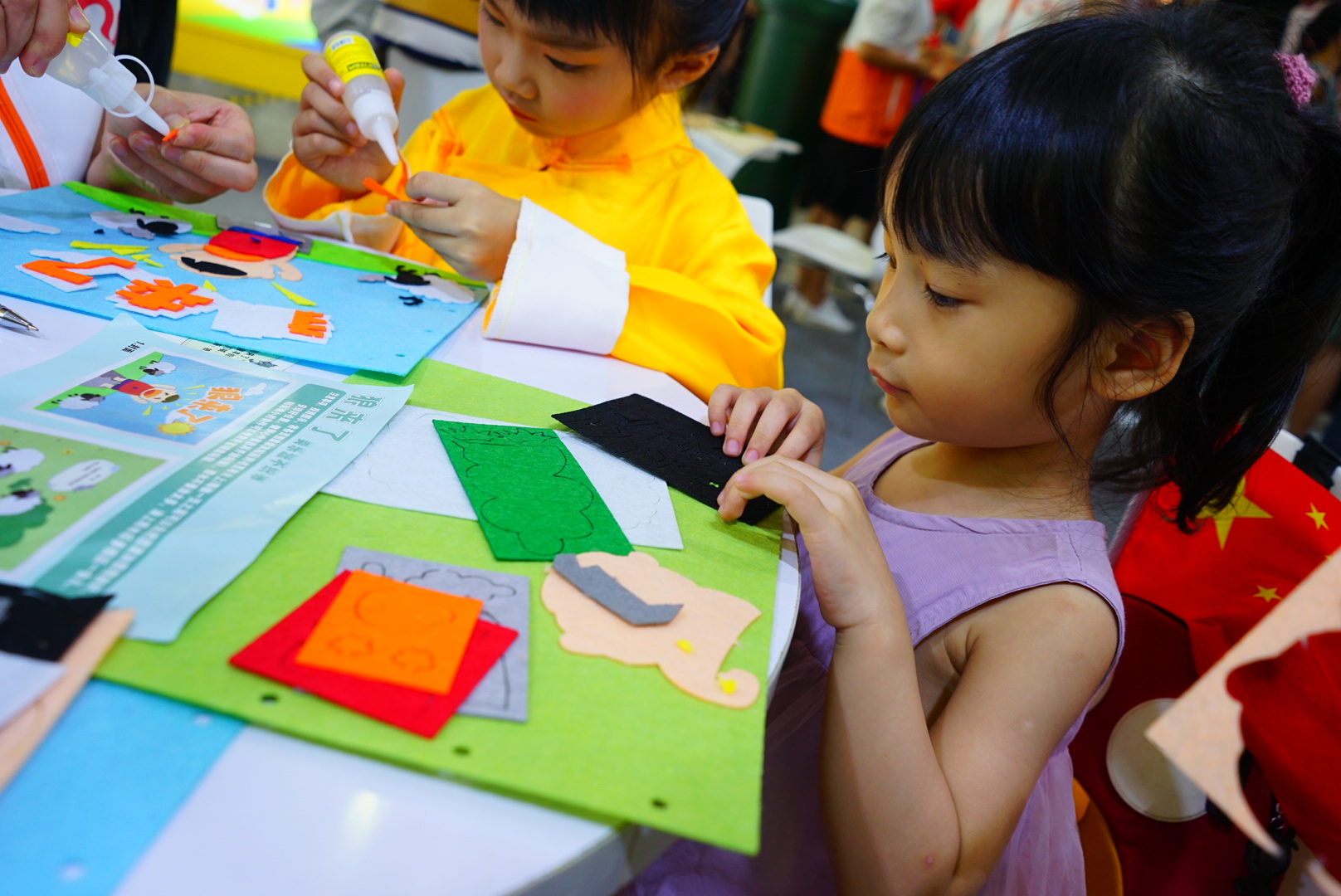 在“手工布書制作”體驗區(qū),志愿者耐心地引領兒童制作專屬自己的一本不織布手工書,感受動手及閱讀帶來的另一種快樂。