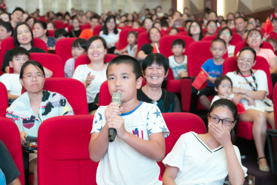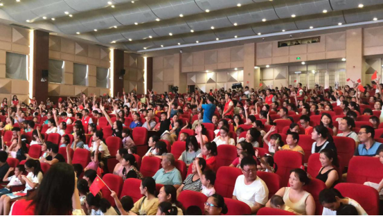 接下來,為進一步增強青少年兒童的愛國意識,主辦方將戲劇教育與愛國教育有機融合,于文明知識問答后,邀請近千名觀眾一起舞動小紅旗,齊聲唱響《我和我的祖國》,點燃了在場每一位觀眾的愛國熱情,觀眾們跟隨著旋律,共同歌唱祖國,深情祝福祖國明天更加輝煌。