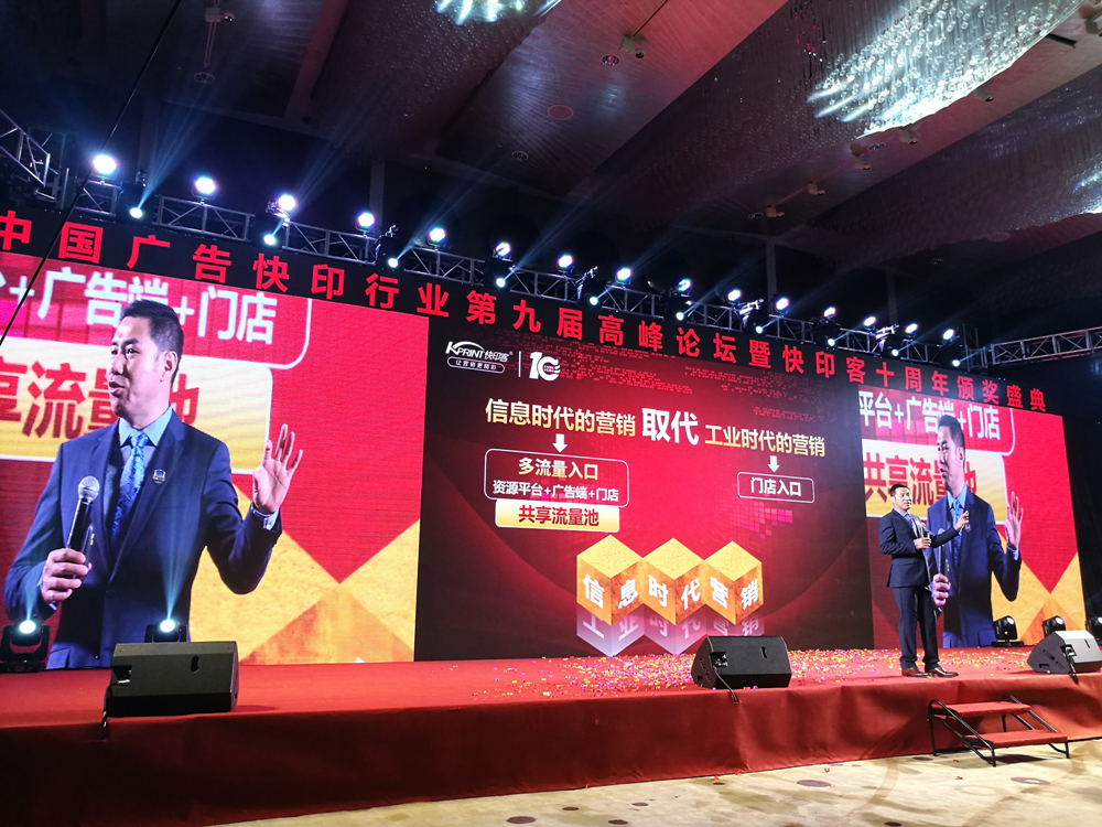 K-Print河南新鄉(xiāng)旗艦店崔總做“K-Print,共創(chuàng)廣告策劃行業(yè)美好新明天”主題演講。崔總分享了他與KP店結(jié)緣的故事,依托KP店重塑企業(yè)品牌,運用“互聯(lián)網(wǎng)+技術(shù)營銷”創(chuàng)新模式推動企業(yè)及行業(yè)的轉(zhuǎn)型與創(chuàng)新,為廣告快印企業(yè)鋪就了一條騰飛美好明天的快車道。