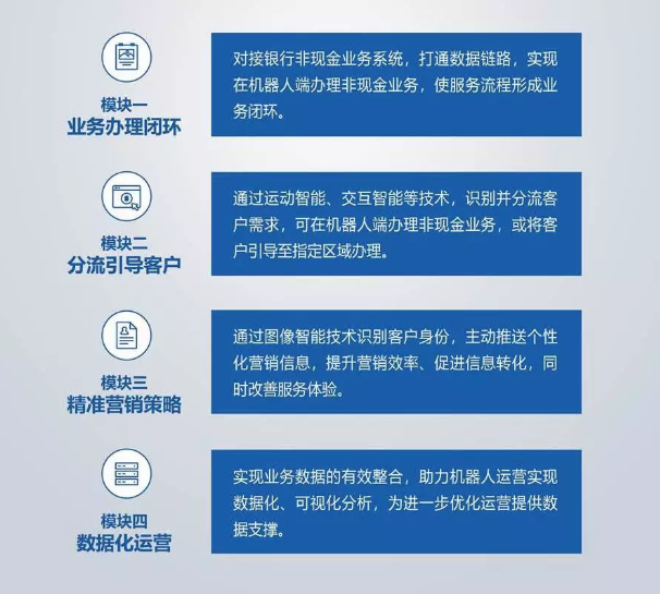 人工智能機(jī)器人與金融業(yè)務(wù)的完美結(jié)合,助力加速金融網(wǎng)點(diǎn)智能化建設(shè)、提升營(yíng)銷效率、豐富金融營(yíng)銷場(chǎng)景。